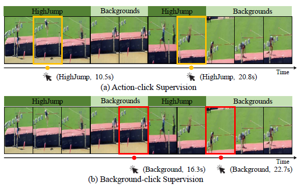단일 프레임 단위로 어노테이션을 진행하는 것인데, 기존의 Click-Supervision의 방식은 Action인 순간을 가지고 annotation을 진행했습니다. 위의 그림 중 노란색으로 칠해진 부분이 Action-click supervision으로 HighJump를 수행하는 몇몇 순간을 알려주고 있습니다.