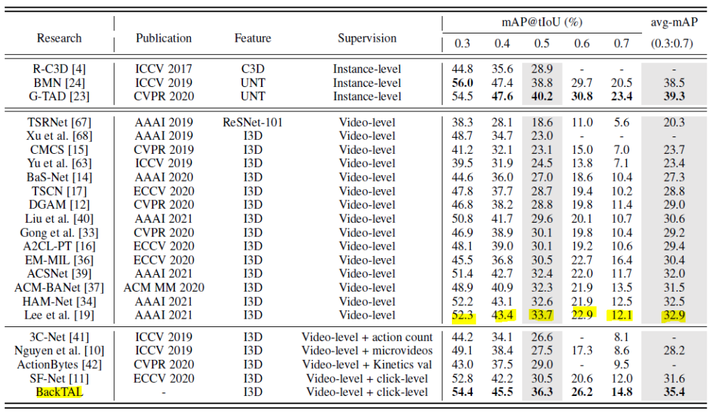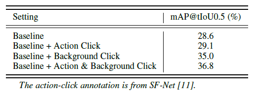 THUMOS14에서의 성능 테이블 입니다. 본 논문의 접근 방식은 기존의 Video-level의 annotation만을 사용하는 Weakly Supervised 방식에서 Click-level의 Supervision이라는 추가적인 정보를 더 사용하다 보니 이를 구분해야할 필요가 있기에 성능 테이블에도 따로 구분을 해주고 있는 모습입니다.