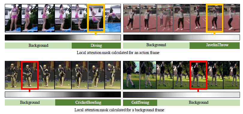이렇게 high-quality의 embedding vector를 얻었을 때, 각 frame과 그 이웃된 frame끼리의 feature 유사도를 계산한 attention mask를 만들 수 있습니다. attention mask는 어디에 사용을 하느냐? 바로 temporal 차원으로 1D convolution을 할 때 단순히 공유된 weight를 사용하는 것이 아니라, local position information이 적용된 attention weight를 추가해서 frame-specific한 연산을 진행할 수 있게 만들어줍니다. 이를 통해 action과 confusing background를 구별할 수 있는 능력이 길러진다고 하네요.