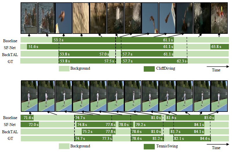 다른 방법론에 비해서 비교적 잘 예측을 수행하고 있습니다. 저자가 밝히는 Back-TAL의 단점은 long action instance를 몇몇 segment로 쪼개는 경우가 있다고 합니다. 이는 view point가 바뀌는 등의 action 내부의 variation이 극도로 커지게 될 때 나타나는 현상으로 weakly supervised localization이 아직 갈 길이 멀었다고 언급합니다.