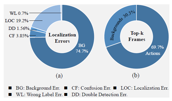 위의 그림(a)를 보면 Weakly Supervised Temporal Localization을 하는데 있어 발생하는 에러 중 Background Error가 가장 큰 비율을 차지하고 있습니다. 저 통계를 어떻게 얻었는지 까지는 설명을 해주고 있진 않지만, 저 정도의 비율을 차지 한다는 것이 꽤나 흥미로운 지표인 것 같습니다.