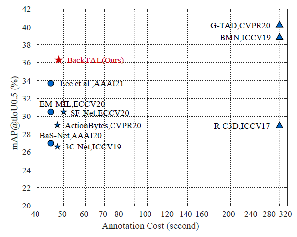 그림에서 볼 수 있듯, 사실 click level로 annotation 했다고 해서 annotation cost가 막 증가하고 그러지 않다고 합니다. 비슷한 annotation cost를 가지는 상황에서는 제일 좋은 성능을 보여주고 있습니다. 저기 위에 보이는 G-TAD랑 BMN은 supervised이니 cost가 큰 대신 성능은 그래도 더 높네요.