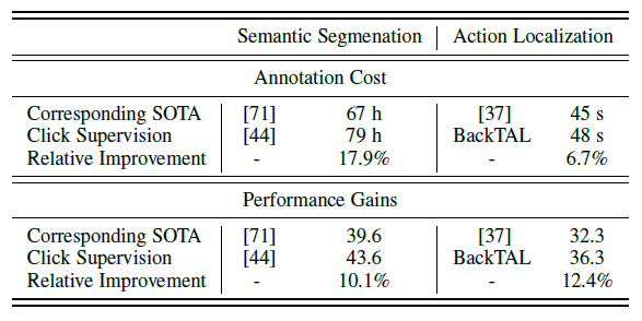 또한 저자는 논문에서 사용한 Click-level의 supervision의 effectiveness를 semantic segmentation domain에서 같이 확인을 해봅니다. 핵심은 click-level annotation을 함으로써 증가되는 annotation의 cost 비율보다 이를 통해 얻는 성능 향상 비율이 더 높다는 점입니다. annotation cost는 6.7% 증가한 것에 비해 성능 향상은 12.4%를 얻을 수 있었네요. 나쁘지 않은 장사다! 이렇게 주장하는 것 같습니다.