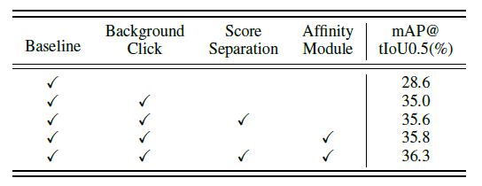 마지막 ablation은 자꾸 비교군으로 등장했던 SF-Net(Action Click으로 학습한)에 Score Separation과 Affinity Module을 가미했을 때 최대 성능을 보여주는 테이블 입니다. 결국 Action Click으로 학습 했을 때의 최대는 32.4에 수렴한 반면, Background Click으로 학습 했을 때는 36.3까지 달성이 가능합니다. 이를 통해서도 역시 Action Click 보다는 Background Click이 더 좋다! 이렇게 생각할 수 있겟네요.