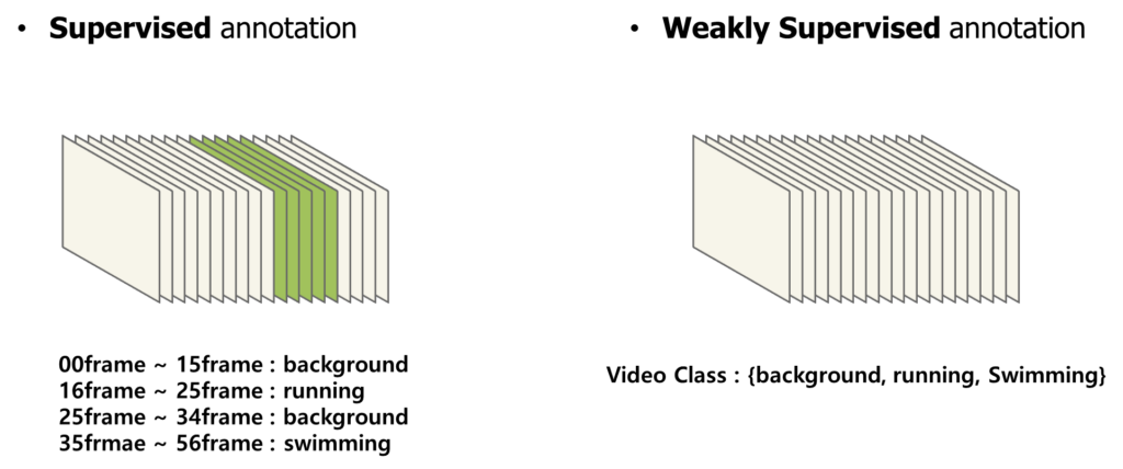 사람들이 Weakly supervised temporal localization에 관심을 가지는 이유는 언제나 Annotation의 부담 때문이라고 한결같이 얘기합니다. Weakly supervised temporal localization은 비디오 단위의 라벨만을 가지고 Localization을 수행하는 작업으로 상당히 어려운 task라 볼 수 있습니다.