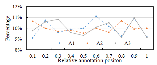 x축이 상대적인 annotation position입니다. 0에 가까울 수록 background segment에 앞부분에서 frame을 sampling 했다는 의미이고, 1에 가까울 수록 뒷부분에서 frame을 sampling 했다는 의미입니다. 임의의 Segment 내에서 특정 구간에만 몰려있다면 그것 또한 문제가 될 수 있겠지요. 하지만 그래프를 보면 대체적으로 모든 위치에서 골고루 뽑은 것을 볼 수 있네요.