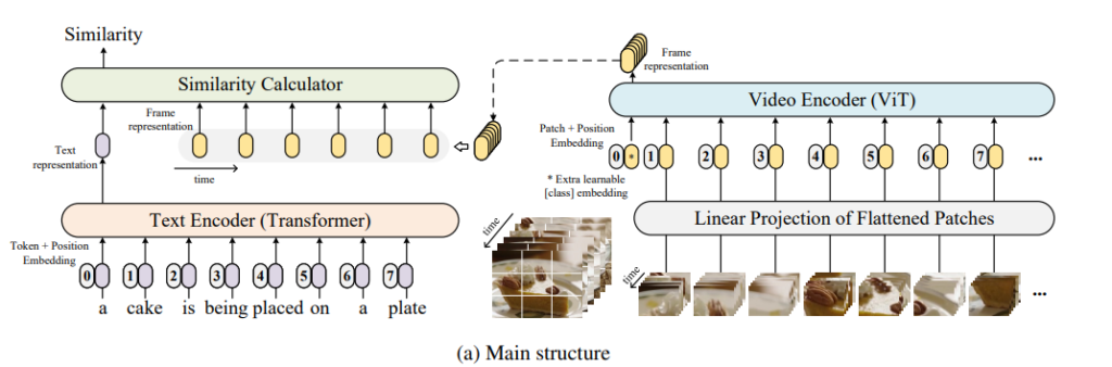 CLIP4Clip 모델은 이를 위해 text encoder, video encoder, similarity calcuatior 로 구성되어 있습니다.