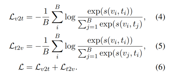 (video, text) 또는 (video clip, text) 로 구성된 batch B 가 주어졌을 때, 모델은 B x B similarities 를 구하고 최적화해야합니다. CLIP4Clip 은 아래와 같은 symmetric cross entropy loss 를 사용하여 학습합니다. (video-to-text, text-to-video)