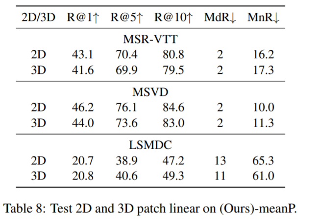 본 논문에서는 3D patch linear 이 temporal information 을 frames 로부터 잘 뽑아서, performance 가 언제나 더 좋아질 거라고 생각했었는데, MSR-VTT 와 MSVD 데이터셋에서는 2D 가 더 좋았다고 합니다.