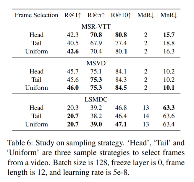 CLIP4Clip 은 uniform frame sampling strategy 를 사용했고, sampling rate 은 1 fps 입니다.