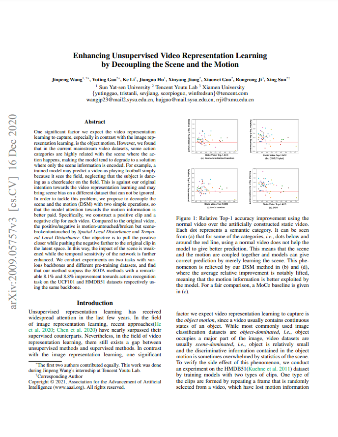오늘 리뷰할 논문은 AAAI 2021에 accept된 “Enhancing Unsupervised Video Representation Learning by Decoupling the Scene and the Motion” 이라는 논문 입니다. 최근 video representation을 목적으로한 여러 연구들에서 motion 정보를 활용하고자하는 방향들이 많이 보이곤 합니다. 해당 논문도 이러한 방향과 마찬가지로, 비디오 내의 scene과 motion을 decoupling 하는 DSM (Decouple the Scene and the Motion)을 제안하여, motion에 좀 더 초점을 맞출 수 있도록 하였습니다.
