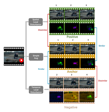 Positive를 구성하기 위해 적용되었던 Spatial Local Disturbance와는 달리, Temporal local Disturbance는 Negative를 생성하기 위해 anchor에 적용되는 방식입니다. 해당 방법론은 모델이 좀더 motion에 집중하도록 하는 것이 목적이기 때문에, anchor와 Negative가 다른 점은 motion pattern이어야하며 anchor로부터 다른 motion pattern을 만들기 위해 두 가지 과정을 거칩니다.