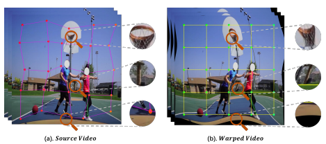 DSM을 구성하는 첫번째 disturbance는 Spatial Local Disturbance 입니다. 이 과정에서는 비디오 내 프레임 간의 motion semantic 한 정보는 유지하되, scene에 의한 local context 정보는 제거할 수 있는 positive 비디오를 생성합니다. 이러한 비디오를 생성하기 위해서는 프레임 내의 spatial한 영역에 변환이 필요하되, 매 프레임 마다 동일한 변환을 취해 temporal context를 유지할 수 있어야합니다. 이것을 목적으로 본 논문에서는 OCR 분야에서 text region을 retify하기 위해 사용된 Thin-Plate-Spline(TPS)를 도입하였습니다. 한 프레임 내에서 N개의 source point를 선정하고, 여기에 x축과 y축으로 랜덤하게 offset을 주어 destination point를 생성합니다. 그리고 각 source point와 destination point를 TPS의 입력으로 Fig 3과 같이 warping 시킵니다. 변환된 것을 보았을 때, 프레임 내 local한 영역 마다 변환이 이루어져 local context가 깨진 것을 확인할 수 있습니다. 그러나 매 프레임 마다 동일한 변환을 적용하기 때문에 motion context는 유지 되게 됩니다.