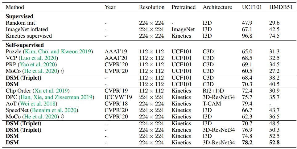 Table 1은 UCF101과 HMDB51에서의 self-supervised action recognition 성능입니다. (Triplet)이 써있는 경우 triplet loss로 학습된 것을 의미하며 DSM의 base network로는 MoCo가 사용되었습니다. 해당 방법론을 사용할 경우 기존 MoCo에서는 62.3의 정확도를 나타냈던 것과 달리, 최대 78.2까지 성능향상을 보이게 되었습니다.