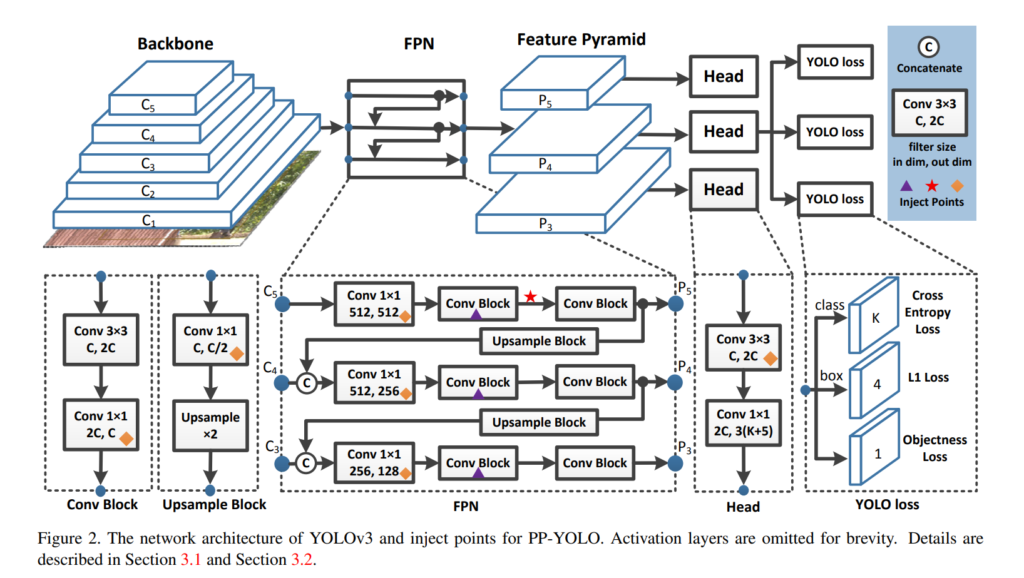 해당 논문에서는 위와같이 아키텍쳐를 설계합니다. YOLOv4와 마찬가지로 아키텍쳐를 Feature extraction, Neck, Head로 나누어서 설명하고 있습니다. 백본은 ResNet50을 사용하였으며 이유는 위에서 설명드렸습니다. 다른 욜로모델과 마찬가지로 3개의 grid map을 뽑으며, 이는 위의 그림에서 C5, C4, C3로 노테이션 되어있습니다. 결국에 각 grid map마다 detection head에서 bbox에 대한 class probabilty와 objectness score, coordinate offsets를 구하는 것이 최종 목표입니다. detection head에서는 1×1 커널사이즈의 convolution을 통해서 채널수를 조정하며, 채널수는 위의 그림에서 보이는 것처럼 3(K+5)가 됩니다. 여기서 K는 the number of classes 가 되며 각각 class에 대한 probability입니다. 5가 의미하는 것은 x, y, w, h에 대한 offset값이며 나머지 1개는 objectness score입니다. 3이 의미하는 것은 각각의 grid cell 마다 3개의 anchor를 사용하겠다는 의미입니다. 이러한 부분들은 기존 YOLO와 아주 큰 차이가 없는거 같은데 그렇다면 위에서 계속 언급하였던 Trick들은 도대체 무엇일까요? 좀 많긴한데 하나씩 이해해 봅시다.