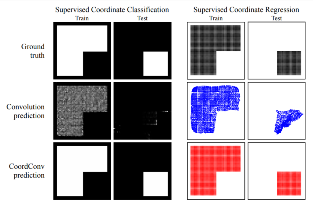 위의 그림에서 보시면 CoordConv가 Coordinate regression을 더 잘 수행한 것을 볼 수 있습니다. CoordConv에서는 간단하게 input level에 2개의 차원을 더 추가하여 Coordinate에 대한 정보를 입력으로 줍니다. 그렇게 했을때, coordinate에 대한 regression이 더 잘 되었음을 위의 그림처럼 정성적으로 확인하였습니다. 이러한 분석은 coordinate regression이 들어가는 object detection에서도 유효한 분석이라고 판단하여 해당 논문에서는 CoordConv를 사용하였습니다.