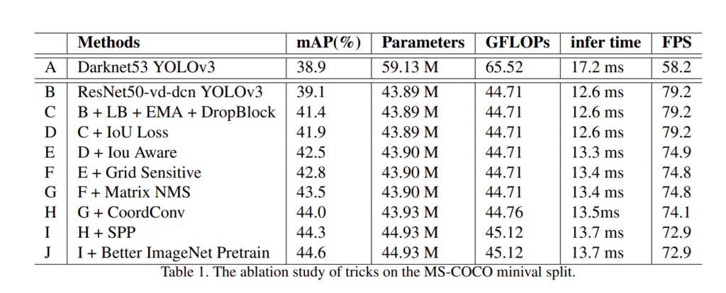 결론적으로 말씀드리자면, 각종 테크니컬한 기법들을 적용하는 실험을 하였으며, 성능을 대량 5퍼센트 정도 많이 끌어올렸습니다. 사실 최종적인 성능을 논하는게 큰 의미는 없는 논문이긴 합니다만, 다양한 기법들을 적용했을때 성능이 올랐다 정도로 해석하시면 될거같습니다. 성능을 논하는게 큰 의미가 없는 이유는 해당 논문의 목표가 다양한 trick들을 적용했을때 성능이 오르는지에 대한 실험논문이기 때문입니다. 논문에서는 더 좋은 backbone들을 놔두고 ResNet50만을 사용합니다. 마찬가지로 더 좋은 augmentation 기법들을 놔두고 mixup만을 사용합니다. 그 이유는 애초에 backbone이나 augmentation은 일반적으로 independent하게 성능을 올릴 수 있는 요소이며, 본 논문에서의 메인 타겟이 아니기 때문에 일단 general한 방법들로 고정해두고 실험을 진행하였다고 합니다. 또한, ResNet과 같이 일반적인 backbone을 사용하면 기존 DarkNet53 백본 대비 호환성면에서 이점이 있습니다. ResNet은 TensorFlow와 PyTorch와 같은 딥러닝 프레임워크에서 거의 무저건 지원하고, 특히나 TensorRT와 같은 최적화툴에서 DarkNet과같은 비주류 백본보다 더 최적화가 잘된다는 장점이 있다고 합니다.(실제로도 꽤나 큰 차이가 났다고 하네요.)