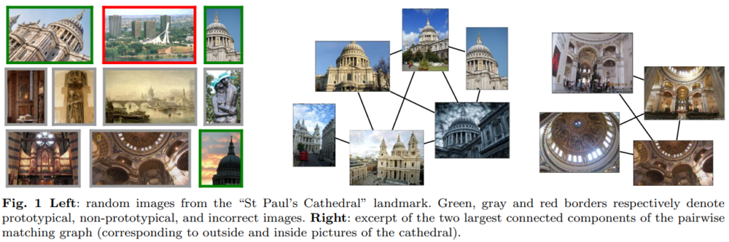 [그림 1]은 Landmarks라는 데이터셋의 예시입니다. 이 데이터셋에는 전 세계의 유명 랜드마크 장소들의 사진이 모여있는데요. 문제는 이 데이터셋에 위와 같이 전혀 상관없는 장소가 같은 장소로 분류되어 있습니다. 그리고 내부와 외부 사진이 혼합되어있죠. 이러한 상태는 효율적인 학습을 방해하기 때문에 논문 저자들은 이 문제를 자동으로 수정할 수 있는 방법을 고안해서 두가지의 수정된 데이터셋을 공개했습니다. “Landmarks-full”과 “Landmarks-clean”입니다.