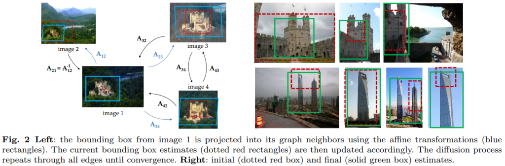 하지만 하나의 문제가 더 있습니다. 정확히 유사한 이미지들을 정제해냈지만, “Bounding box”를 어떻게 추정하는지에 대한 문제가 남았습니다. 대략적인 Box위치를 빨간색과 같이 가지고 있을 때, 파란색 혹은 초록색과 같이 전체 건물을 커버할 수 있도록 수정할 필요가 있다고 합니다. 이 과정도 앞에서 사용했듯이 keypoint를 매칭시키도록 diffusion process를 업데이트하며 수행해주었다고 합니다.