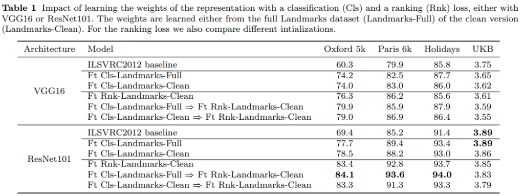 이렇게 설계한 R-MAC 베이스라인과 설계한 두가지 loss(Cls, Rnk)가 성능에 미치는 영향을 분석하기 위해 실험을 수행합니다. 일단, 학습은 ImageNet pretrained weight에서 Lanmarks데이터셋으로 파인튜닝 하는 방식으로 진행했는데요. 일단 성능이 전반적으로 크게 올랐습니다. 다만 Rnk loss는 Landmarks-Full에서 성능이 좋지 않아서 단독 실험은 빠졌다고 합니다.