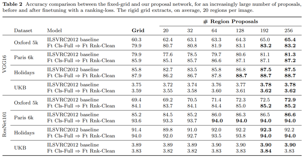 Grid는 베이스라인 성능이고, Region Proposal의 성능이 R-MAC의 그리드를 RPN으로 대체한 성능입니다. 전반적으로 성능이 올랐지만, ResNet에서는 VGG에 비해 큰 성능 향상을 보이지 않았습니다. 논문 저자들은 이에 대해 원래 Resnet 자체가 배경을 덜 보고, representation을 잘 만들어서 그렇다고 분석합니다. 그래서 딱히 RPN을 적용할 필요가 없기 떄문에, 이 뒤의 실험에서 Resnet의 경우 RPN을 적용하지 않고 실험했다고 합니다.