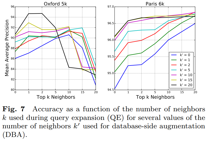 성능 평가에서 알 수 있듯이 데이터셋에 따라 성능이 오르거나 떨어지는데요. 이건 Paris 데이터셋에서는 쿼리와 관련된 이미지가 데이터셋에 많아서 그렇다고 합니다. 이러한 성능 평가를 통해 QE는 1로, DBA는 20으로 설정했다고 합니다.