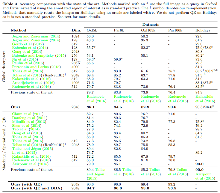 다른 방법론들과 비교해봤을 때, 큰 폭으로 성능이 오른 것을 확인할 수 있습니다. 일단 성능이 오르지 않은 것처럼 보이는 Holidays 데이터셋에서는 평가 프로토콜이 다르기 때문에 그 부분을 감안하면 SOTA입니다. 결국 이 논문 저자들이 말하는 최종적인 내용, 물체 중심의 이미지 검색은 기존의 pretrained된 모델로는 적합하지 않으니 파인튜닝을 해야한다는 주장이 옳다는 것을 크게 오른 성능으로 보입니다.