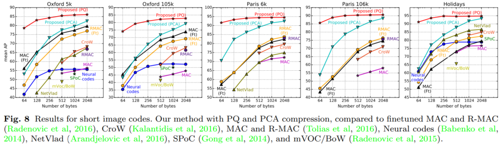 검색 시스템의 효율성을 위해서 PCA와 PQ에 대한 실험도 함께 수행했습니다. PCA와 PQ에 대한 학습은 Landmarks-clean에서 수행했다고 합니다. 표 아래의 숫자가 압축된 descriptor 크기인데요. 역시 제안된 방법론이 전반적으로 압축을 해도 성능이 좋았고, 그중에서도 PQ가 정확도가 떨어지는 정도가 가장 덜했습니다. 이건 사실 실제 시스템에서 적용할 때, 검색 속도와 저장공간 문제를 해결하기 위해 적용하는 방법론이라… 이정도만 알면 될 것 같습니다.