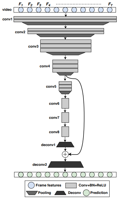 사실 이 FCN이라는 모델 자체가 semantic segmentation에서 널리 사용되고 있어서, 논문 저자는 semantic segmentation에서 RGB 이미지를 입력하는 것을 video summarization 용으로 고치기만 했습니다. 이미지가 m * n * 3의 입력을 가지고 있었다면, 여기서는 1 * T * D의 입력을 넣는거죠. (T는 비디오 프레임의 갯수, D는 feature dimension) 그리고 모든 spatial convoulution을 temporal convolution으로 바꾸었습니다. 이걸 바꾼 이유와 동일하게 spatial maxpooling과 deconvolution layer도 temporal한 연산을 지원하게 바꾸었다고 합니다. 그리고 Conv4의 output을 deconv에서 skip connection 연산을 수행해주는데요. 이는 비디오 요약에서 필요한 temporal information을 복원하는데 도움이 되기 때문에 이렇게 수행했다고 합니다.