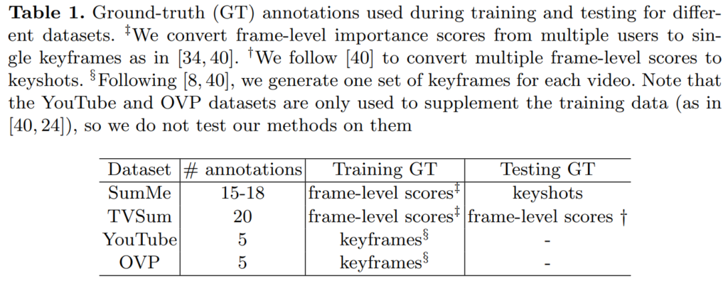 이 논문에서는 keyframe / non-keyframe 형태의 binary 형태로 라벨링된 값을 바탕으로 비디오 요약을 학습하는 것에 집중합니다. 특정 프레임이 주어지면, 이 프레임이 키프레임인지 아닌지 구분하려는 것이죠. (비디오 요약에서 프레임이 키프레임인지 알게되면, 해당 프레임이 존재하는 세그먼트를 요약할 세그먼트로 지정하기 때문에 이런 방식이 가능합니다.)