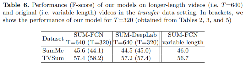 이 실험도 볼만한 실험이었는데요. 입력 비디오의 길이를 160초로 제한함에 따라 발생하는 성능 차이에 대한 실험입니다. 제가 예상한 것과는 다르게 T의 값을 좀 더 길게 바꾸어서 좀 더 비디오를 길게 본다고 해서 무조건 성능이 오르는 것은 아니라는 것을 확인할 수 있었습니다. “variable length”은 이러한 고정길이 입력을 강제하지 않았을 때의 성능인데, SumMe에서는 꽤 좋은 성능을 보이는 것을 볼 수 있습니다.