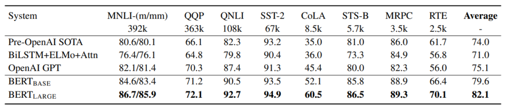 그래서 GLUE 벤치마킹을 통한 실험을 보면 BERT가 모든 task에서 제일 높은 성능을 보여주고 있습니다. BERT base만 하여도 다른 방법론들 대비 좋은 성능을 보여주는 데 BERT Large를 사용하면 base 보다도 훨씬 더 좋은 성능을 보여주고 있네요.