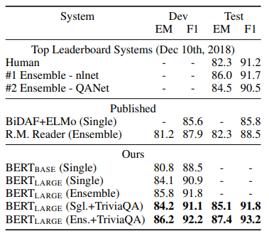 사실 여기서 SQuAD 리더보드에 대한 언급이 논문에서 나왔는데 무슨 소리인가 이해를 하질 못했습니다. 뭐 결론만 받아들이면 SQuAD라는 유명한 Question Answering이라는 task에서도 SOTA를 달성하였습니다.