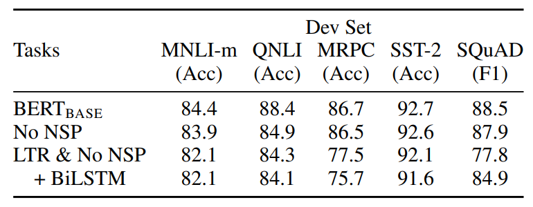 일단 NSP를 제거했을 때 Base 보다 성능이 조금 떨어지는 것을 볼 수 잇습니다. 그래도 성능 하락의 폭이 그렇게 크지는 않아보입니다. 그런데 NLI 계열의 task에서는 성능이 많이 떨어지는 이유가 Natural Language Inference task는 문장간 논리적인 구조 파악이 중요한 task인데 NSP를 사용하지 않으면 이러한 부분이 약해지기 때문에 성능 하락이 크게 발생하였네요.
