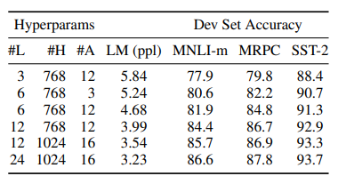 간단하게 말해서, 측정한 데이터셋에서는 모두 모델이 커질수록, 정확도가 상승함을 볼 수 있습니다. 특히 BERT의 경우에는, downstream task를 수행하는 dataset의 크기가 작아도, pre-training덕분에, model의 크기가 클 수록 정확도는 상승함을 볼 수 있습니다.