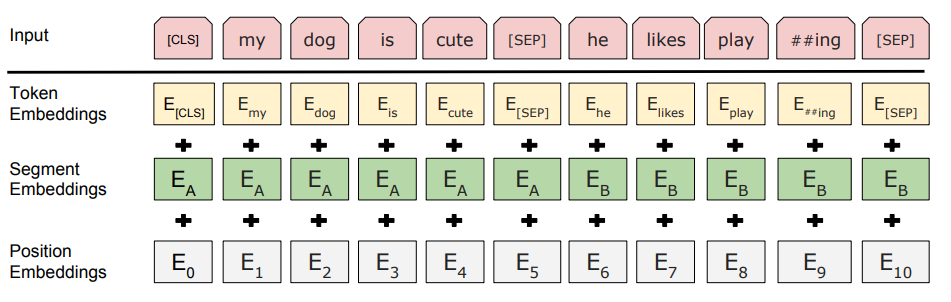 저는 자연어 처리 task가 기계 번역같은 것들만 있는 줄 알았는데 그게 아니라 Question and Answering과 같은 두 개의 문장 입력이 필요한 task도 있다는 것을 본 논문을 통해 알았습니다. 여기서 중요한 것은 첫번째 문장과 두번째 문장을 구분해야할 필요가 있겠죠? 따라서 Segment Embedding은 두 개의 문장을 구분하기 위한 임베딩으로 임베딩 벡터의 종류는 문장의 최대 갯수인 2개 입니다.
