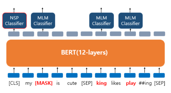 그래서 보면 [CLS] 토큰을 통해 Next Sentence Prediction를 수행합니다. 입력으로 들어온 두 문장이 이어지는 관계인지 아닌지 그와 동시에 Masked embedding vector에 대해서는 각각 Classifier를 달아서 원래 무슨 단어였는지 예측하는 과정을 수행하게 됩니다.