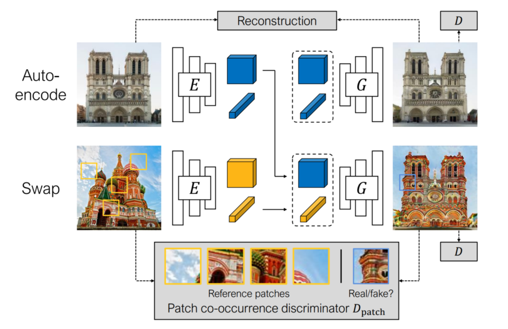 Swapping autoencoder라는 구조는 쉽게 말해 E라고 표현된 encoder와 G라고 표현된 Generator로 나뉘어 있습니다. 그림속에서는 Encoder와 Generator가 각각 2개씩 존재하는 것처럼 보이지만, 실제로는 각각 하나씩 존재하여 weight를 공유한다고 보시면 될 것 같습니다.