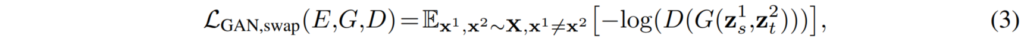 여기서 s와 t는 각각 structure와 texture를 의미하며 i는 몇번째 영상인지를 나타냅니다. 예를 들어서 z_{s}^{1}라고 한다면 첫번째 이미지에서 추출한 structure code라고 볼 수 있겠네요. 아무튼 이제 그림2에서와 같이 저자는 Generator의 입력으로 1번째 이미지에서 추출한 structure code와 2번째 이미지에서 추출한 texture code를 조합하여 넣습니다. 그리고 그렇게 생성된 결과는 GAN loss를 통해 진짜 영상인지 가짜영상인지 구분하는 방식으로 학습이 됩니다.