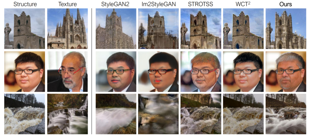 그에 비해 논문에서 제안하는 방법론은 structure를 잘 살리면서 동시에 texture도 자연스럽게 입힌 모습입니다.