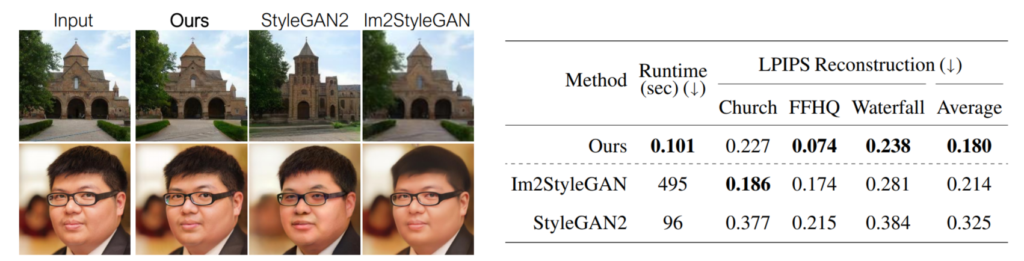 마지막으로 논문에서 제안한 방식이 과연 reconstruction을 얼마나 잘 표현하였는지를 나타내는 결과입니다. 좌측 그림부터 보시면, StyleGAN2는 눈동자를 잘 못살린다던지, 성의 texture 및 structure들이 모두 잘못 표현된 모습입니다.