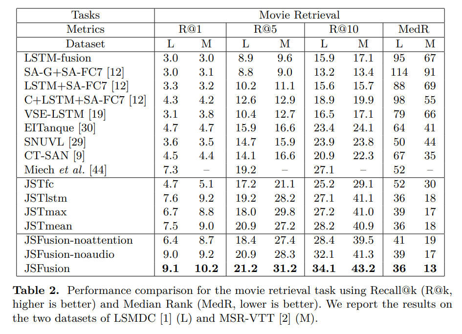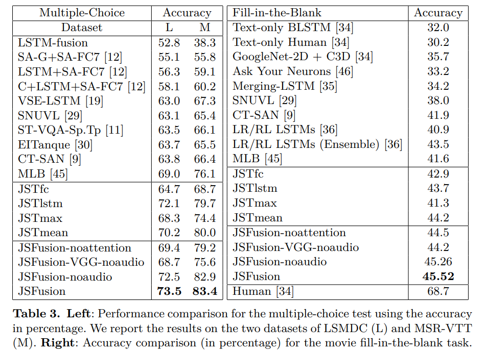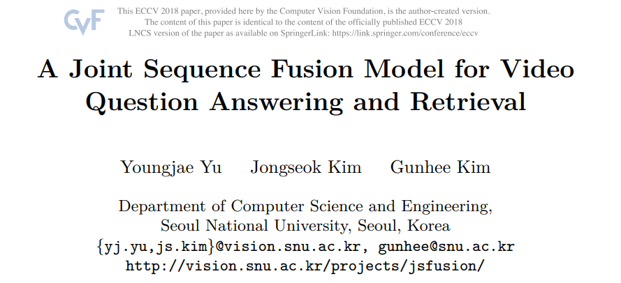 본 논문은 서로 다른 모달리티의 sequence 데이터 간의 Semantic Similarity 를 계산할 수 있는, JSFusion (Joint Sequence Fusion) 이라는 이름의 방법론을 제안합니다. 결과적으로 해당 방법론을 사용했을 때, Multimodal Retrieval 에 대해서는 sota, Video QA 에 대해서는 sota에 대적할만한 성능을 냈습니다.