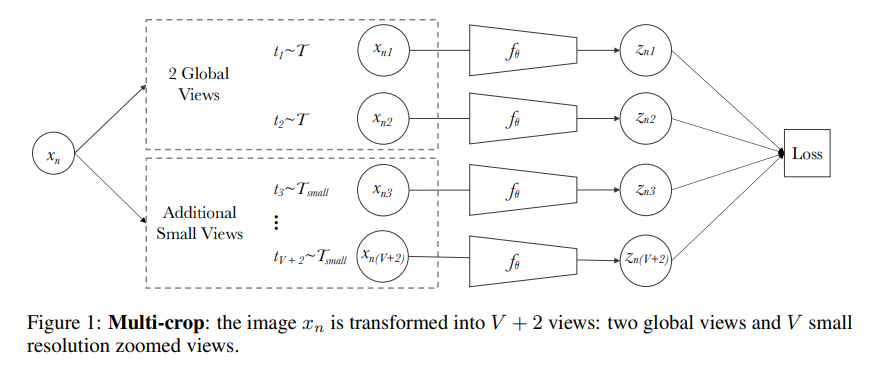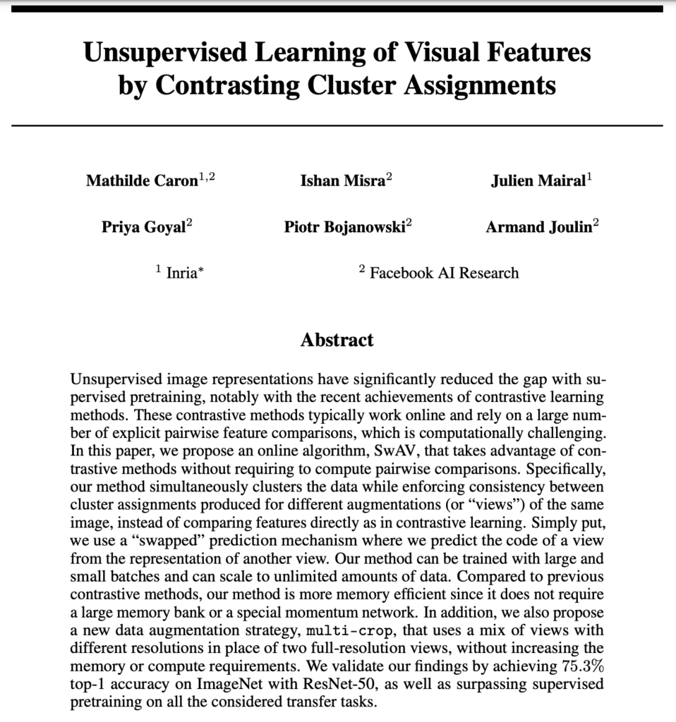 따라서 본 논문에서 제안하는 Swapping Assignments between multiple Views of the same image (SwAV)는 clustering 기법으로 대표적인 클러스터 representation을 지정하고, 이를 통해 더 많은 군집끼리 비교하여, 더 큰 비교가 가능하도록 학습 방식을 제안하였습니다. 즉, 개별 images 별 feature가 아닌 similar한 feature를 group으로 할당하여 구별하는 clustering 기법을 사용하였습니다. 이 때, 일반적인 클러스터링 방식은 online learning이 아니기에, self-learning에 적합하도록 SwAV에서는 온라인 학습 기반의 클러스터링 방식을 제안합니다. 추가로 multi-crop이라는 새로운 augmentation 기법으로 한 장의 이미지 내에서 다양한 크기의 multi-crop을 생성하여 성능 향상으 가져왔다고 리포팅하기도 합니다.