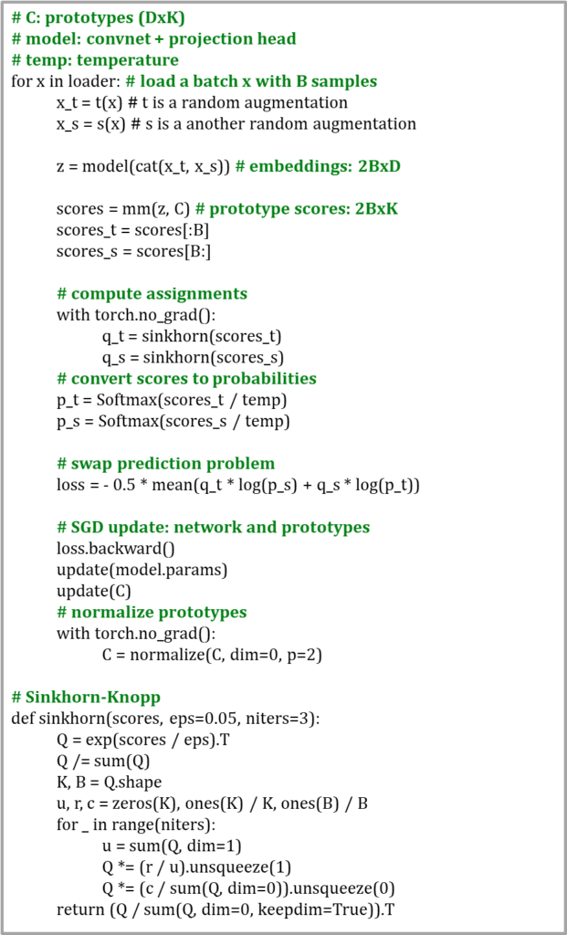 다시 말해, 같은 image로부터 2개의 다른 augmentation view features인 z_t와 z_s가 주어졌을때, K prototypes c_1, c_2, ... c_Kset에 일치시켜 codes q_t와 q_s를 계산합니다. 이후, 아래와 같은 loss function을 사용하여 “swapped” prediction problem을 제안합니다.