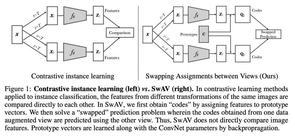 일반적인 clustering 기법은 전체 image dataset의 image features를 clustering하고 cluster code(clustering numbering)을 부여하는 방식인 offline 방식입니다. 여기서 code는 cluster assignment를 의미합니다. 이러한 방법은 학습을 진행할때 feature를 업데이트하기 위해, 전체 image dataset을 반복적으로 input하기 때문에 target이 계속 변하는 online 학습에는 시간적 문제때문에 practical하지 않습니다. 따라서, 논문에서는 cluster code 자체를 target으로 간주하지 않고 image로부터 생성된 augmented views로 부터 cluster code를 할당하고 동일한 image로 부터 생성된 다른 augmented views로부터 cluster code를 예측하는 방법을 제안하였습니다.