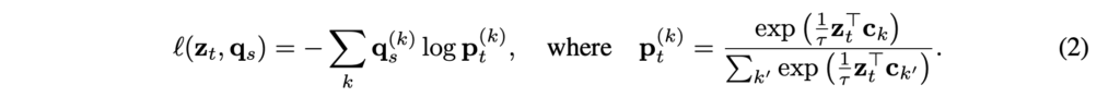 SwAV의 핵심은 프로타타입 벡터와 code를 훈련과정 동안 online 방식으로 업데이트 하는 데 있습니다. 그렇다면 위의 총 loss함수에서 l(zt,qs), l(zt,qs)[\latex]은 다음과 같이 정의될 수 있는데요. [latex]l(zt,qs)는 feature zt 로부터 다른 변환 방식으로 augmentation된 code qs를 예측하는 것으로qs와 zt, C로부터 얻은 softmax code 확률 간의 cross entropy loss로 정의할 수 있습니다. (Equation 2, τ는 temperature 파라미터)