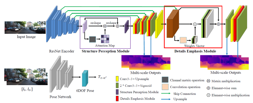 기존 CNN based U-Net 구조의 depth estimation 방법론들은 semantic 정보만을 가지고 예측을 하기 때문에 디테일한 부분이나 영상 전체의 구조적인 부분은 고려하지 못해 성능에 한계가 있다고 합니다. 따라서 이러한 문제를 극복하기 위해서 이 논문에서는 두가지 방법론을 제시합니다.