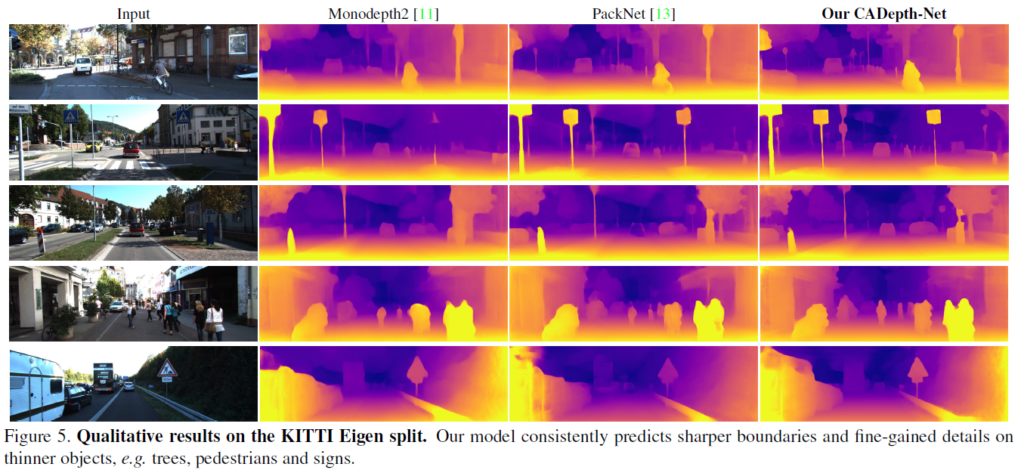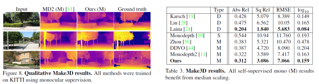 다음은 정성적 결과입니ㅏㄷ. 이 결과 비교를 DDV랑 하면 더욱 좋았을 것 같으나 뭐… 정성적 결과는 씹고뜯고 맛보고 즐기기 좋은 Monodepth2와 PackNet으로 하는게 국룰이라 봐주도록 하겠습니다. 그래도 음… 좀더 깔끔하게 이기는걸 보여주는게 좋았을 것 같다는 생각이 있습니다.