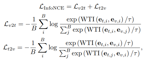 Text-to-video retrieval loss와 Video-to-text retieval loss를 함께 사용하는, InfoNCE loss 를 사용합니다.