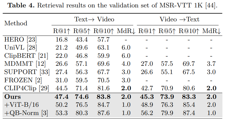 - CLIP4Clip 의 training schedule 을 따라서 공평하게 비교합니다.